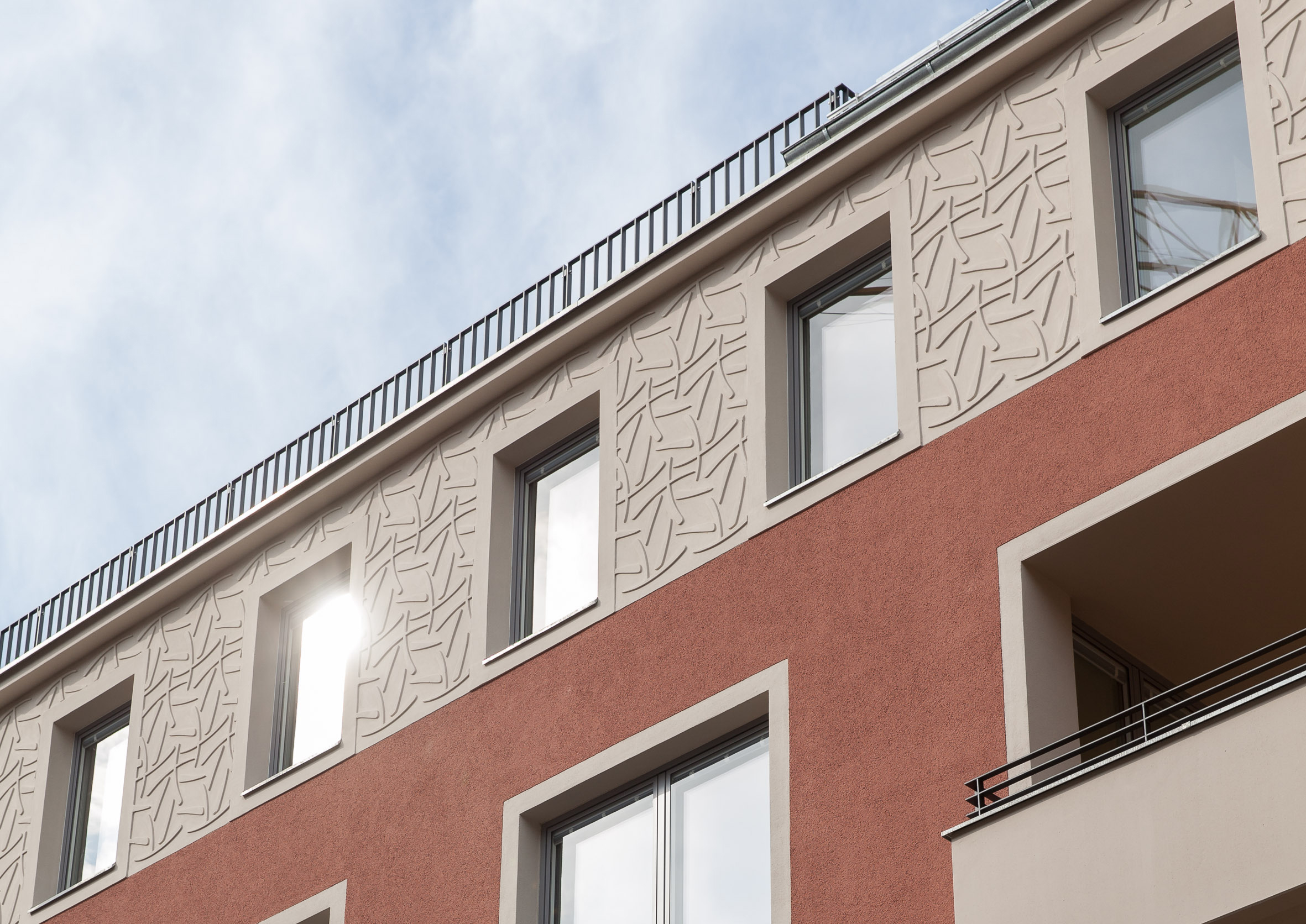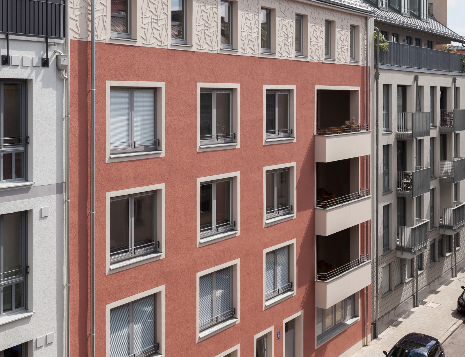 Die Fassade knüpft mit asymmetrischer Gliederung, Faschen, unterschiedlichen Körnungen und Farben an die Putztradition Schwabings an. Als gebaute Erinnerung an den Innenhof und um das optische Gewicht des zusätzlichen Geschosses in der Höhe zu mildern ist die oberste Ebene mit Blattornamenten verfeinert. Die zarte Grafik wurde in Zusammenarbeit mit dem Typographen Peter Langemann aus den Initialen des Bauherrn entwickelt.