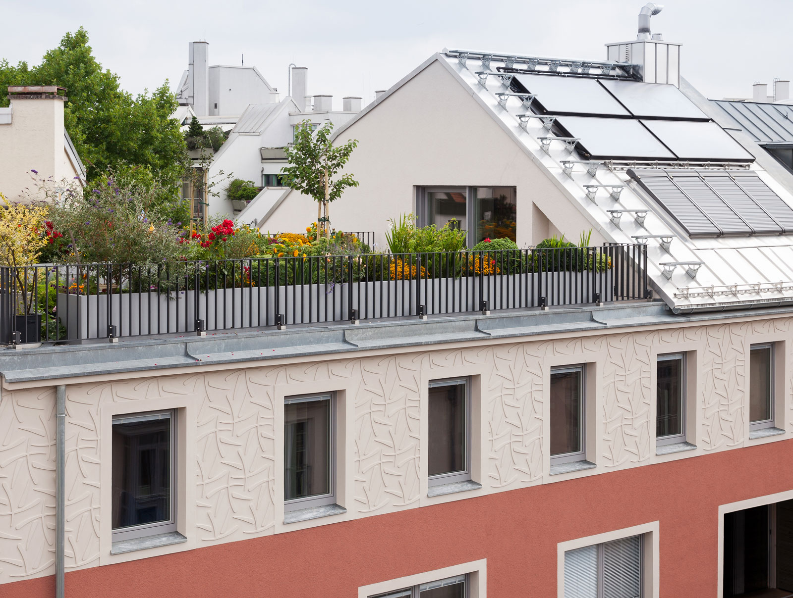 Das 5-geschossige Schwabinger Wohnhaus in Niedrigenergiestandard durfte wegen des ungünstigen Eckgrundstücks um ein Fassadengeschoss höher ausgeführt werden, als alle Nachbarn. Der Bauherr bedauerte zunächst den Abbruch des kleinen Vorgängergebäudes mit üppig bepflanztem Innenhof, womit ihn nun der große Dachgarten des Neubaus versöhnt.